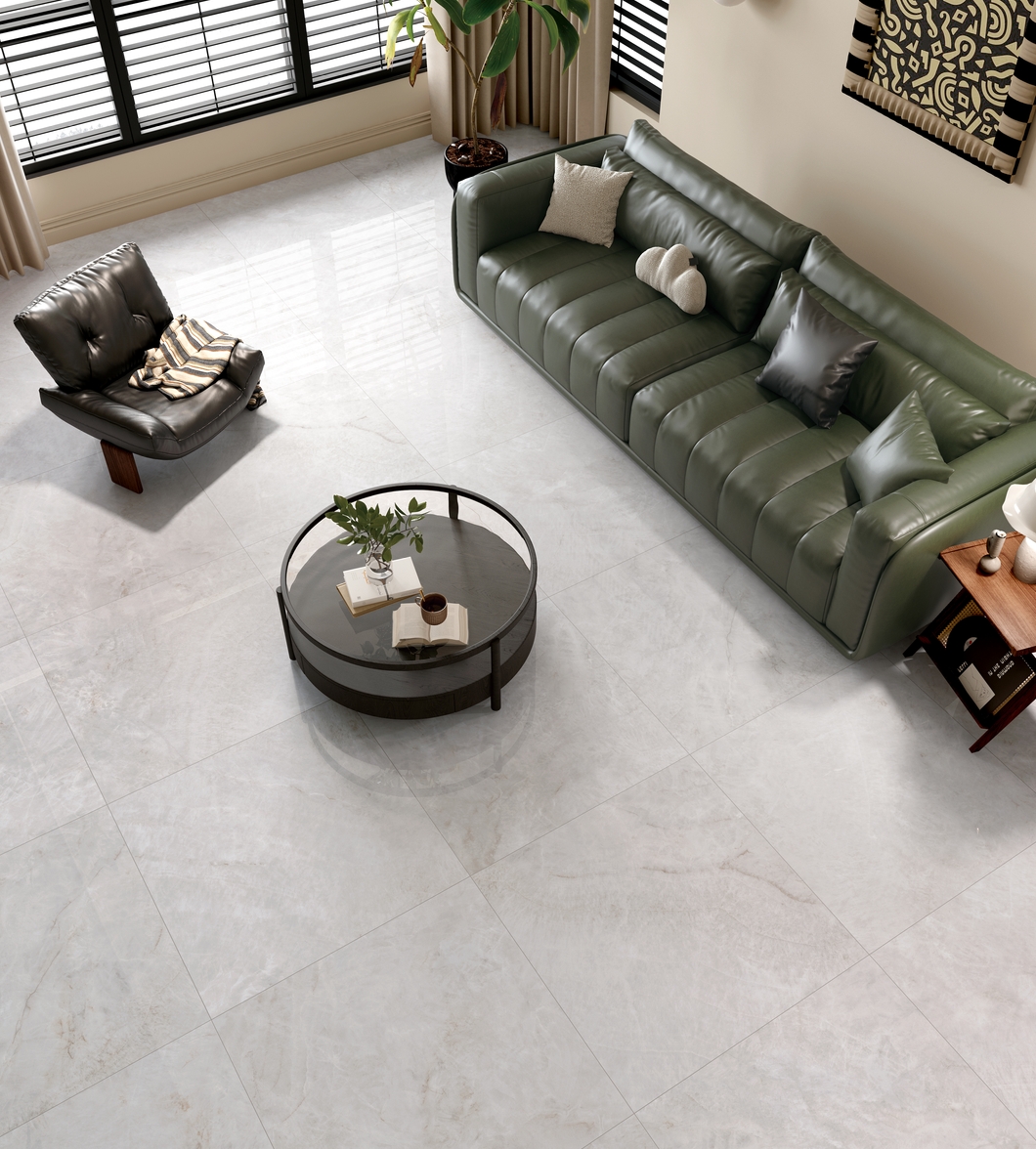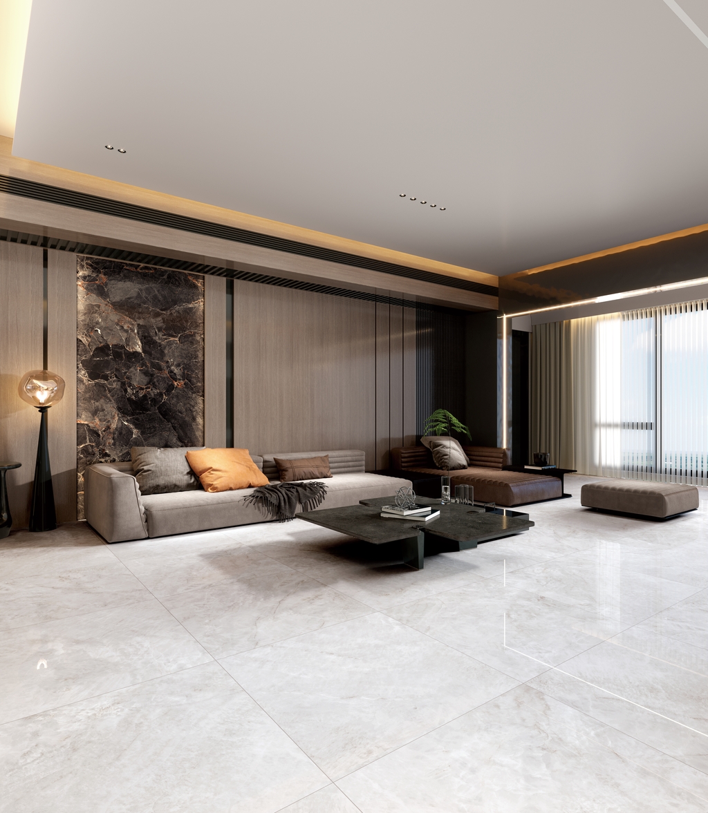 銀灰色的磚面上附著這大片絮狀紋理,形成了絢麗的銀灰色版面,猶如云母貝獨特的生長紋,高透柔美的玉質凝脂感和均勻的質地,在光線照射下泛起溫婉細膩的虹彩。