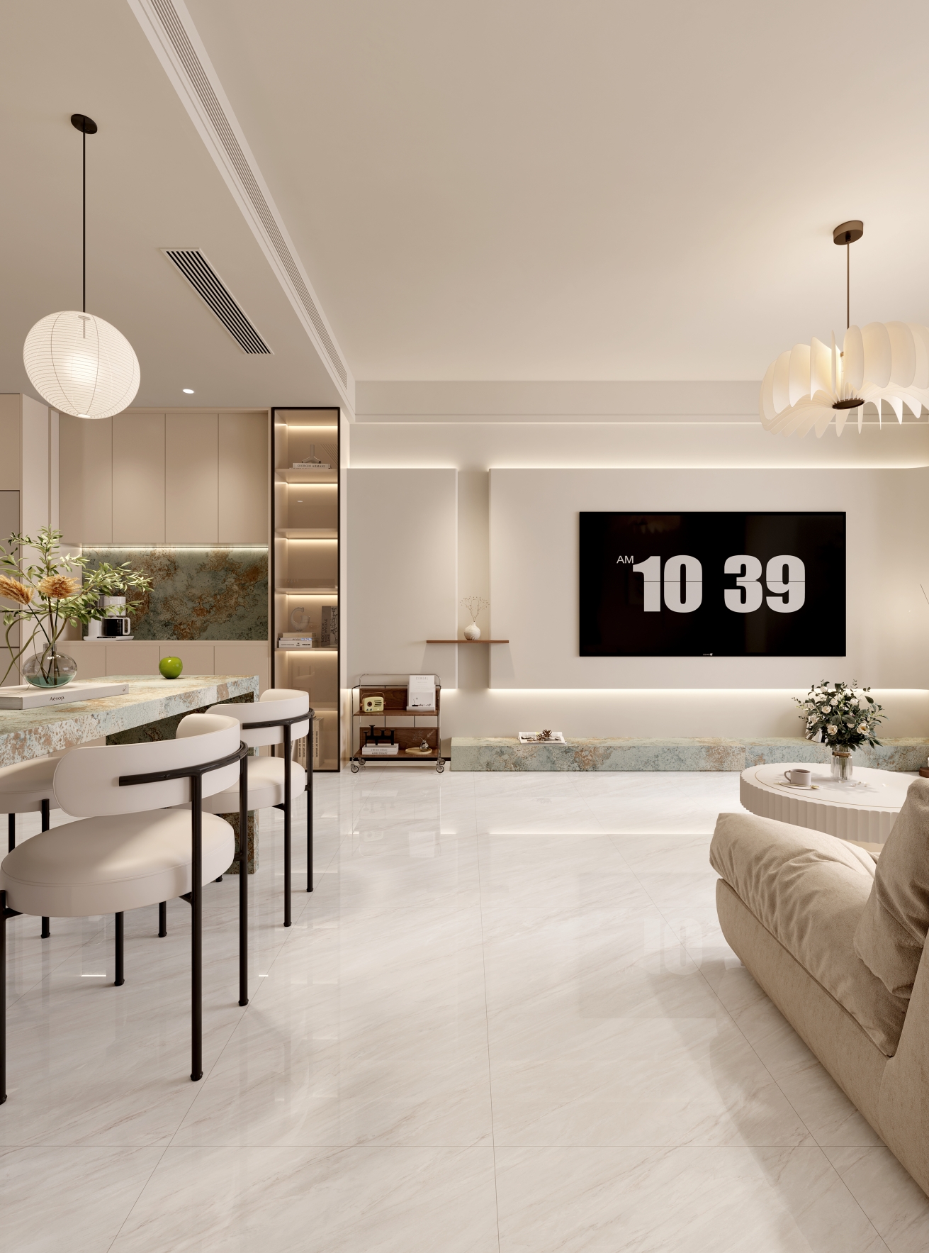以淡雅米白色為基調,交織淺褐色紋理,如珊瑚暈染,又如玉石脈絡,盡顯優雅質感,鋪貼后為空間增添一份高雅格調,營造出舒適且具有品味的家居氛圍。