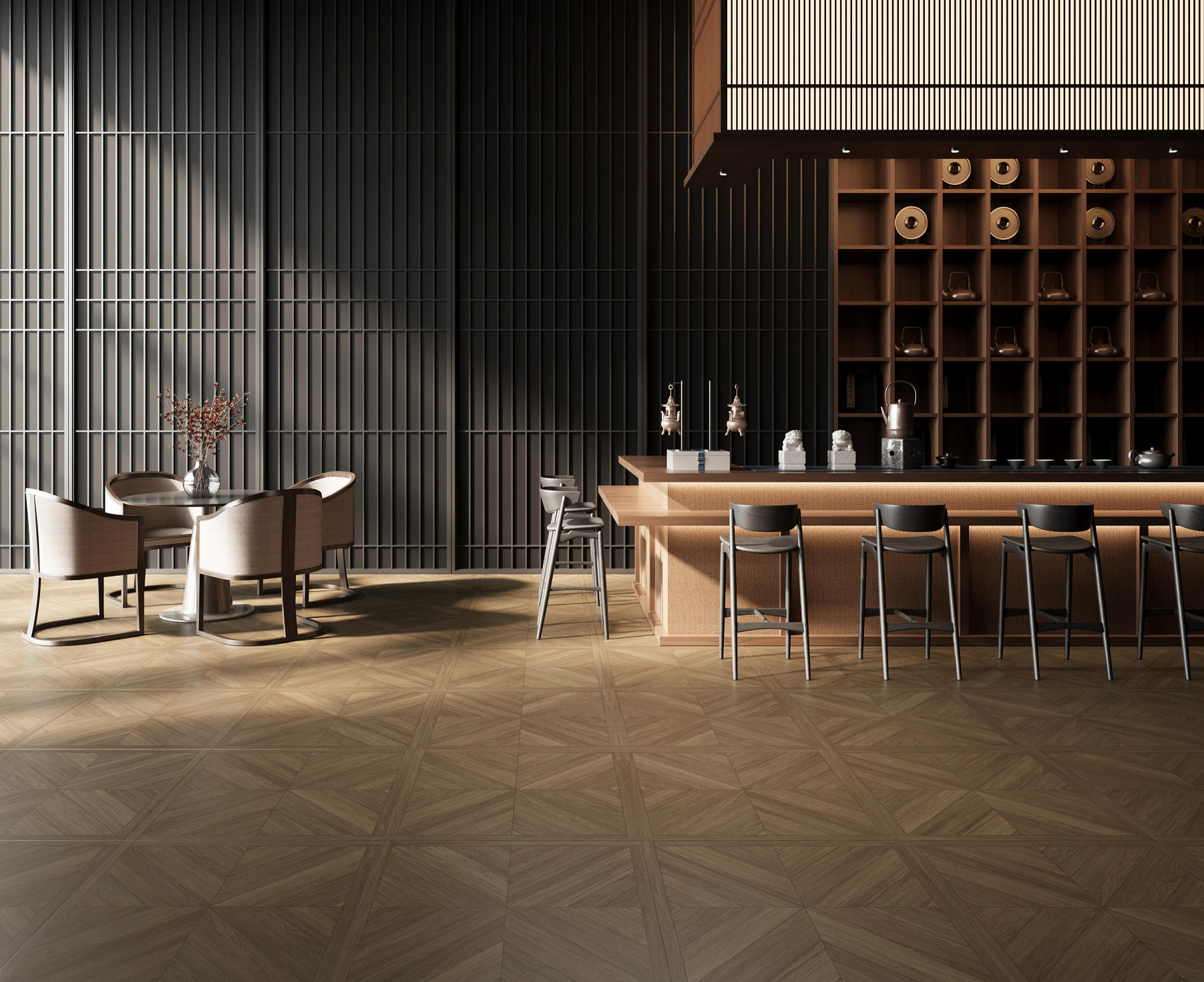 秋棠菱歌米字紋理如葉脈般舒展,在視覺上消解了空間的邊界感,卻又以利落的線條勾勒出層次。像給空間鋪了一層會呼吸的柔光,襯出溫潤的松弛感。