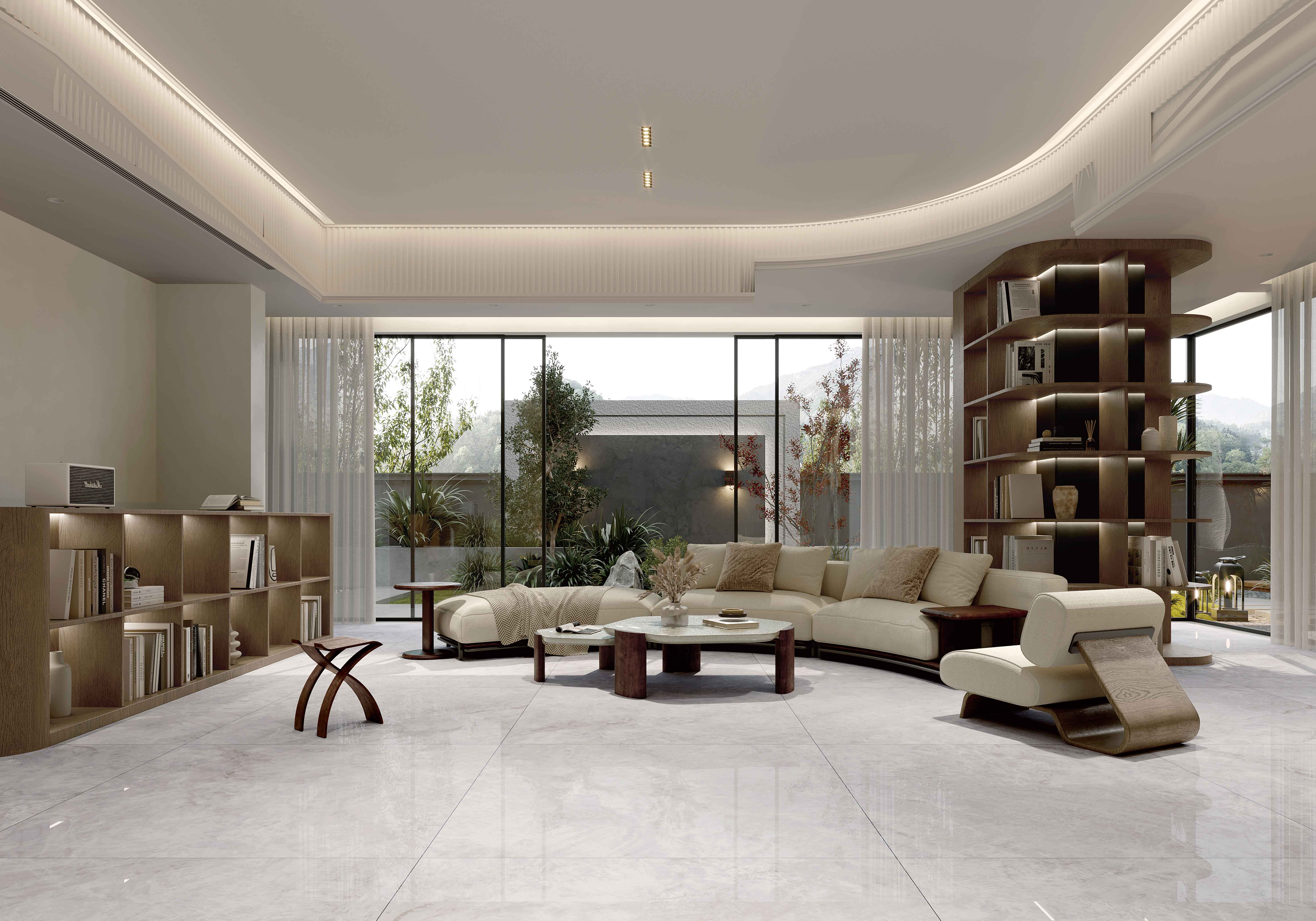 銀灰色的磚面上附著這大片絮狀紋理,形成了絢麗的銀灰色版面,猶如云母貝獨特的生長紋,高透柔美的玉質(zhì)凝脂感和均勻的質(zhì)地,在光線照射下泛起溫婉細膩的虹彩。